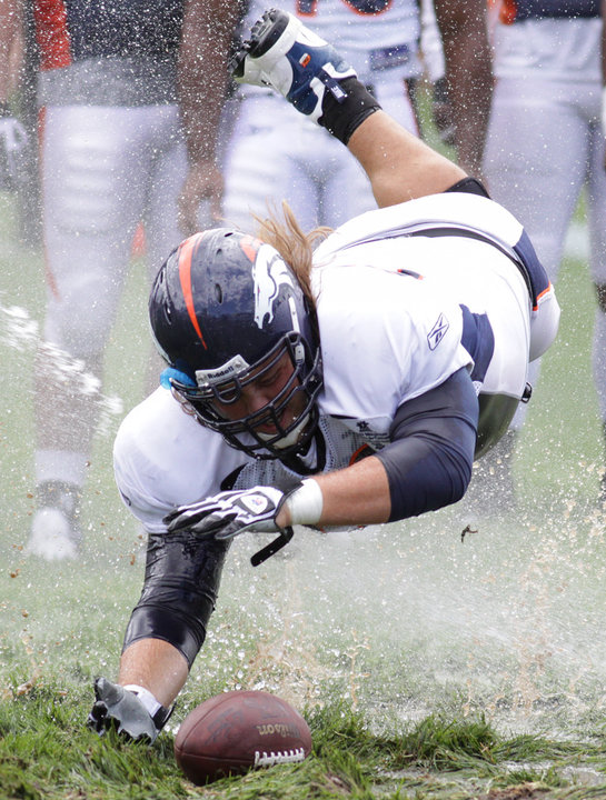 Broncos offensive lineman Eric Olsen soars through the spray. Englewood, Colo.; Aug. 5, 2010.