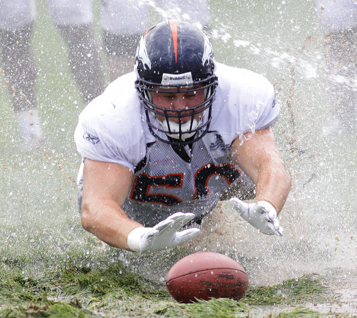 Center J.D. Walton dives through the spray for the football during a rookie-initiation drill. Englewood, Colo.; Aug. 5, 2010.
