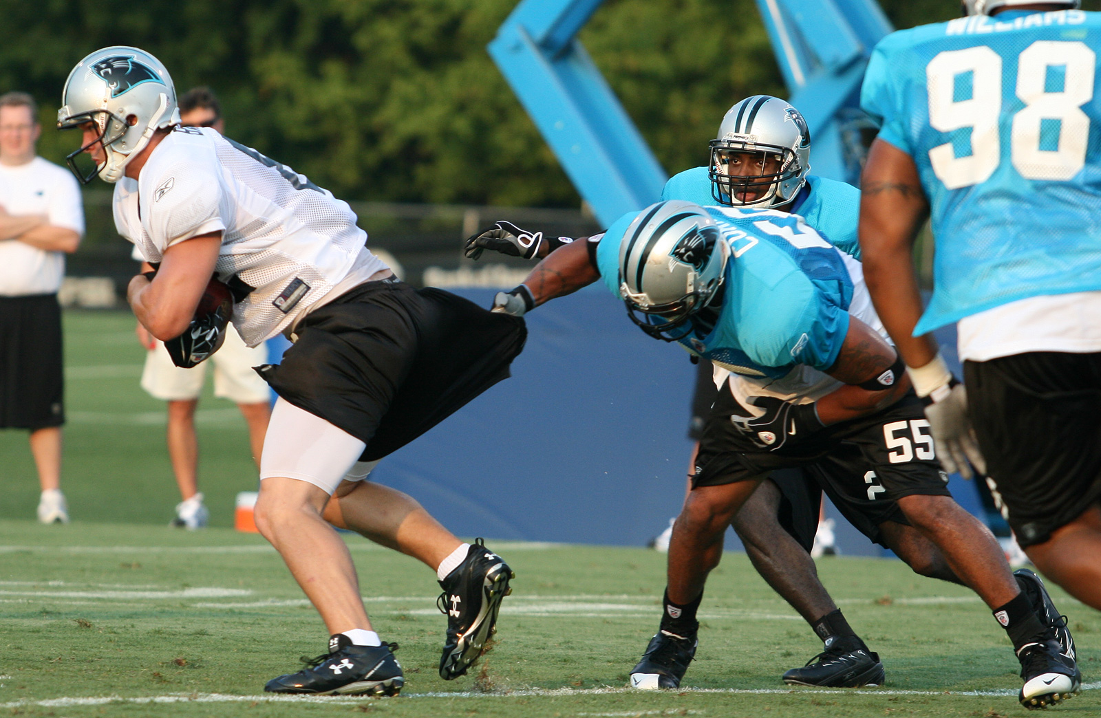 Gary Barnidge gets stopped when Donte Curry gets a hold of the elastic waistband during the Panthers’ 2008 training camp.