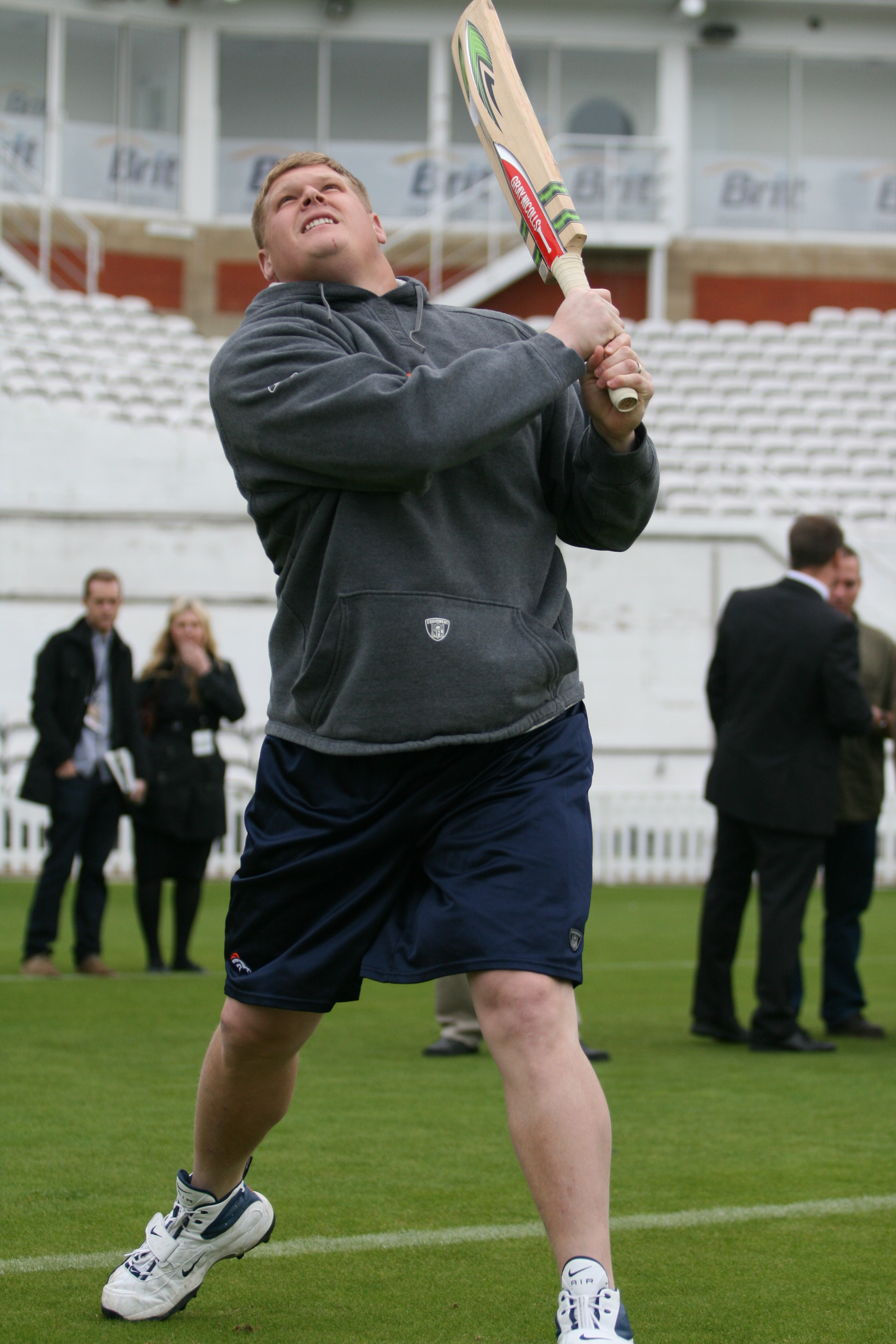 Broncos left guard Chris Kuper gives cricket a go prior to a practice at The Oval in London on Oct. 29, 2010.